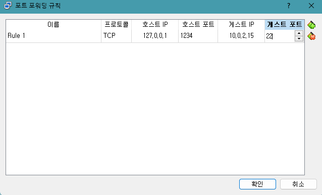 10.0.2.X 대역의 네트워크에 접속하기 위해서 포트 포워딩 규칙을 설정 해준다.