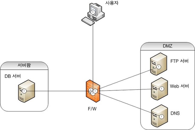 그래서 웹서버는 DMZ( Demilitarized Zone, DMZ란 내·외부 네트워크 구간 사이에 위치한 중간지점으로, 침입차단시스템 등으로 접근 제한 등을 수행하지만 외부 네트워크에서 직접 접근이 가능한 영역)에 위치하게 하고, DB서버는 서버팜(일련의 컴퓨터 서버와 운영 시설을 한 곳에 모아 놓은 곳)임.