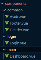 components 폴더안에 나중에 로그인도 만들고 해야하니 일단 common으로 Aside.vue, Footer.vue, Header.vue를 묶어주고 login 폴더를 만들어주고 그 안에 Login.vue 컴포넌트 만들어주고, main 폴더를 생성하고 main 폴더 안에 Dashboard.vue를 만들어준다.